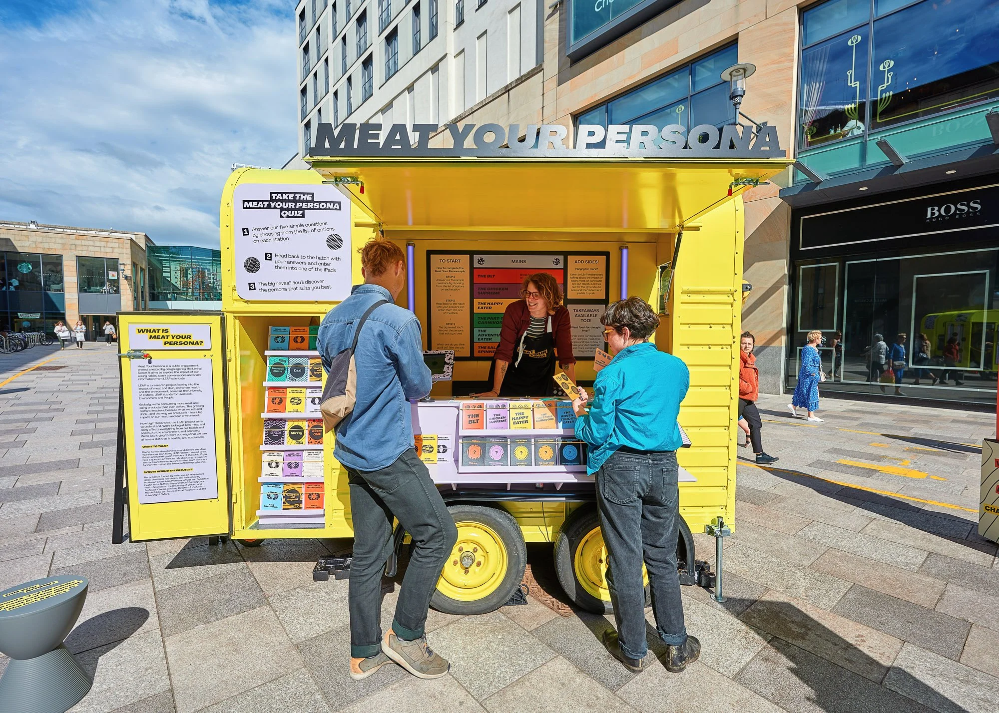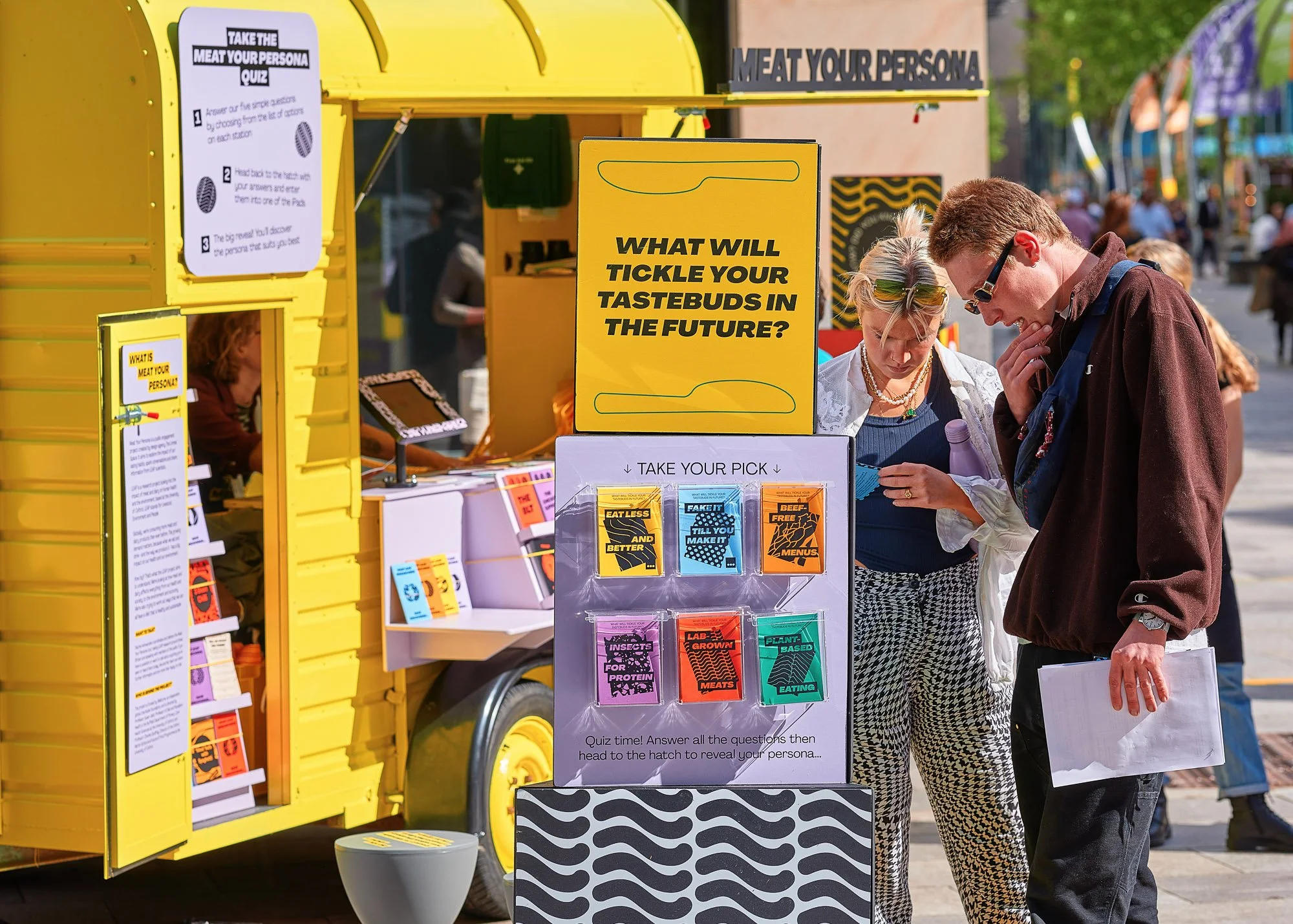 We brought all of this research together to build a custom-made, bright yellow horsebox, filled with facts and insights that could be accessed through a personality quiz. Topline provocations and questions presented themselves on freestanding structures, from which visitors made choices as they went around, culminating in an interactive reveal of their meat personality, along with recipe cards and pledges to support and encourage behaviour change. We captured the voices of LEAP scientists, playing them through the structures of the installation and using QR codes to take users to a specially designed website containing further information and tools.