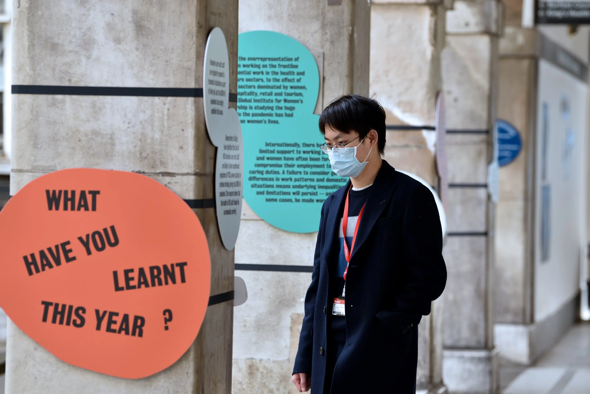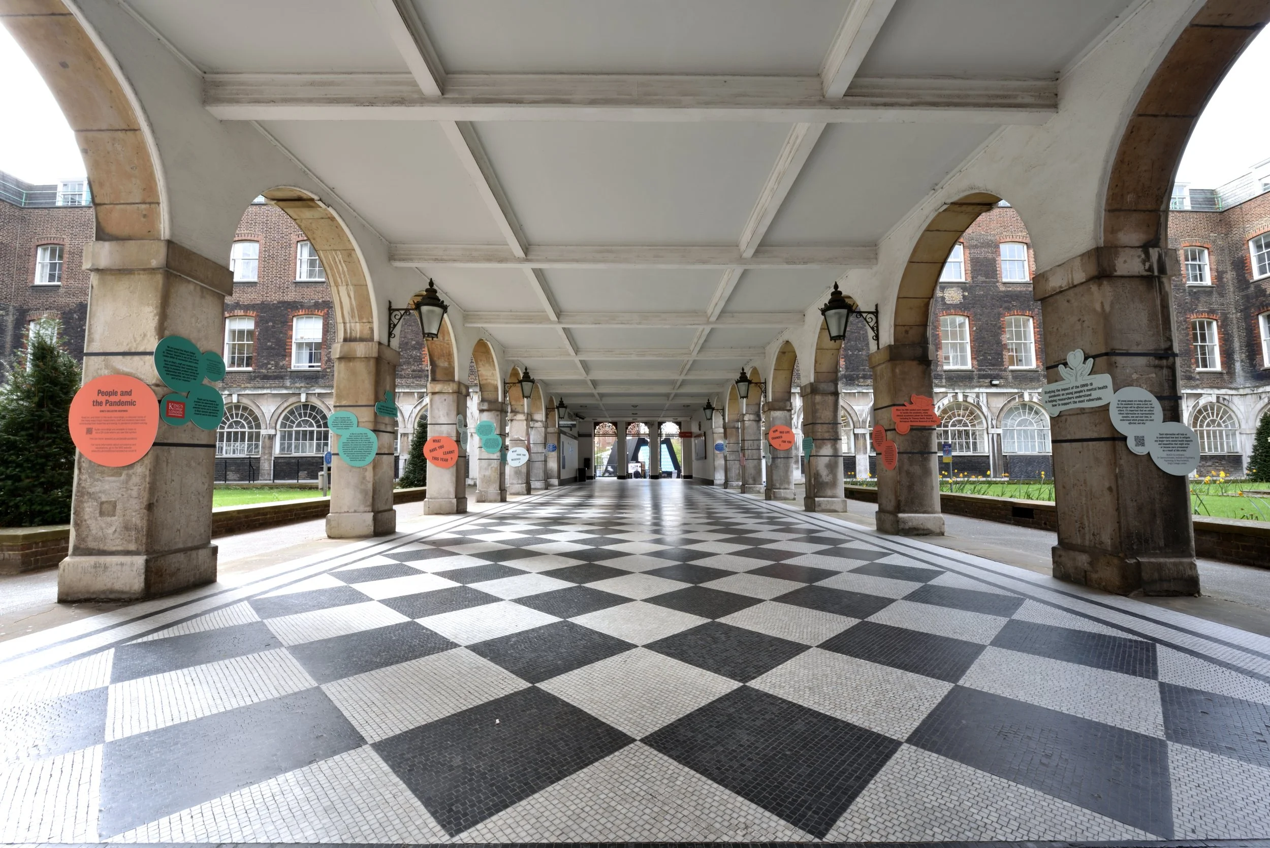 Large scale visuals were designed and produced, covering the Science Gallery London windows and the London Bridge entrance to the campus, whilst smaller graphic elements were placed on pillars along the Colonnade that connects several parts of the university. We embedded QR codes in the graphics, each of which linked to a short podcast we created with one of the people or teams behind the stories.