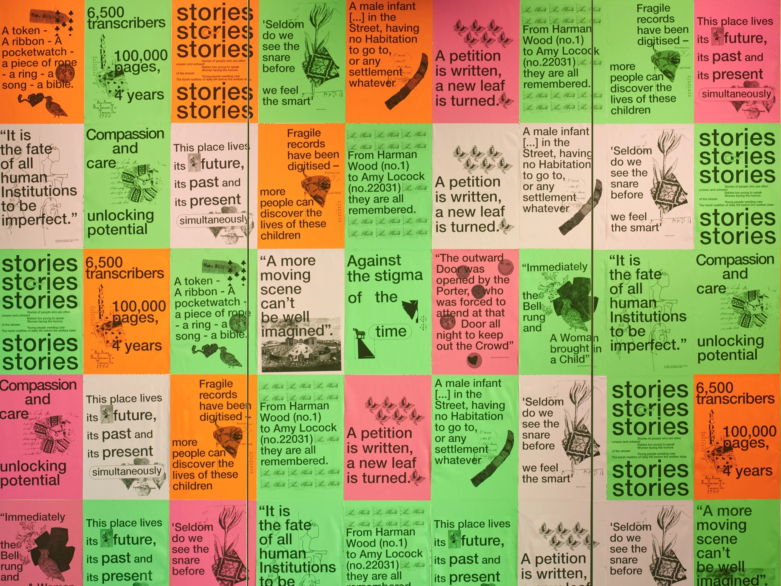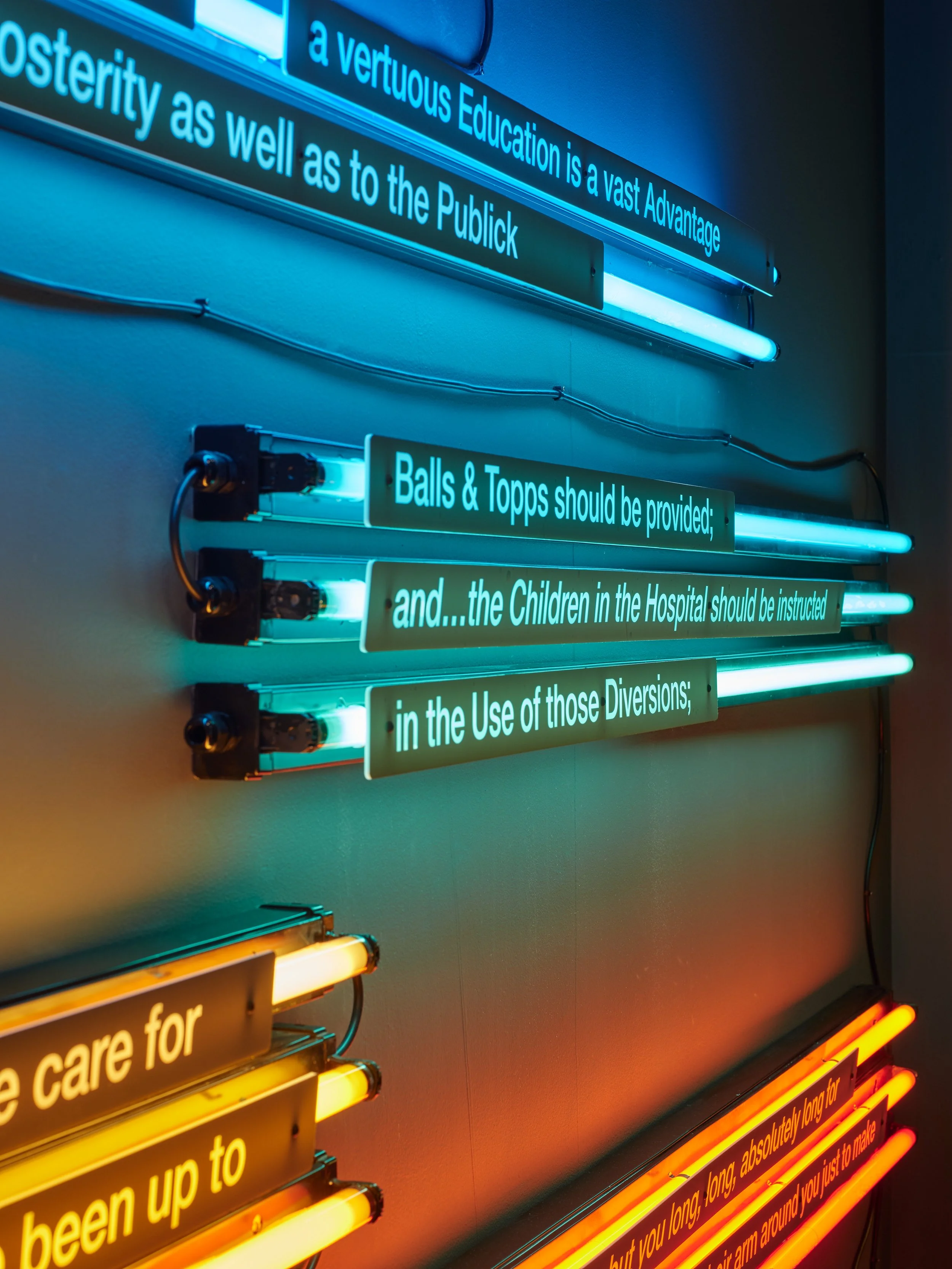 We transformed Coram’s main entrance with a bright and eye-catching neon poster display and large ribbons running from ceiling to floor that hark back to Coram’s extensive archive. Neon light boxes illuminated quotations from past and contemporary sources, encouraging visitors to form connections with different voices throughout history. An immersive soundscape invited visitors to engage with more detailed stories and narratives, as the ethereal and dreamlike audio enveloped the space. Visitors heard first-hand the hopes, dreams and desires of care experienced young people whilst watching a multi-screened animated montage of their imagery and text.